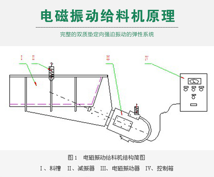電磁振動給料機是一個較為完整的雙質(zhì)墊定向強迫振動的彈性系統(tǒng), 整個系統(tǒng)工作在低臨界共振狀態(tài),主要利用電磁激振器驅(qū)動槽體以一定的傾角做往復振動,使物料沿槽移動。