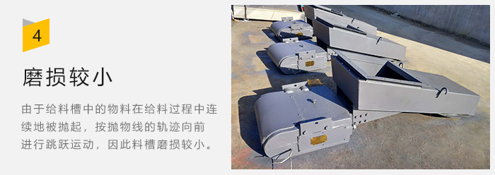 5、由于給料槽中的物料在給料過程中連續(xù)地被拋起,按拋物線的軌跡向前進(jìn)行跳躍運(yùn)動(dòng),因此給料槽的磨損較小;