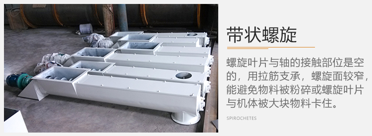 2)帶狀螺旋,這種螺旋葉片與軸的接觸部位是空的,用拉筋支承,螺旋面較窄,能避免物料被粉碎或螺旋葉片與機(jī)體被大塊物料卡住,在輸送大塊和粘性物料時(shí)被采用。
